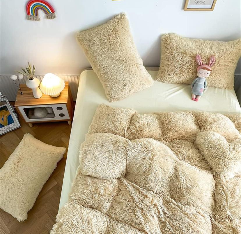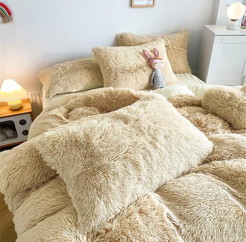 Faux Fur Fluffy Light Khaki Duvet Set 4by6/ 6by6/ 6by7/ 7by7 Size – Ultra Soft, Shaggy, Cozy and Fuzzy 4/6 Pieces Fur Bedding Set (1 Fluffy Duvet, 1 Bedspread, 2/4 Pillowcases Set)