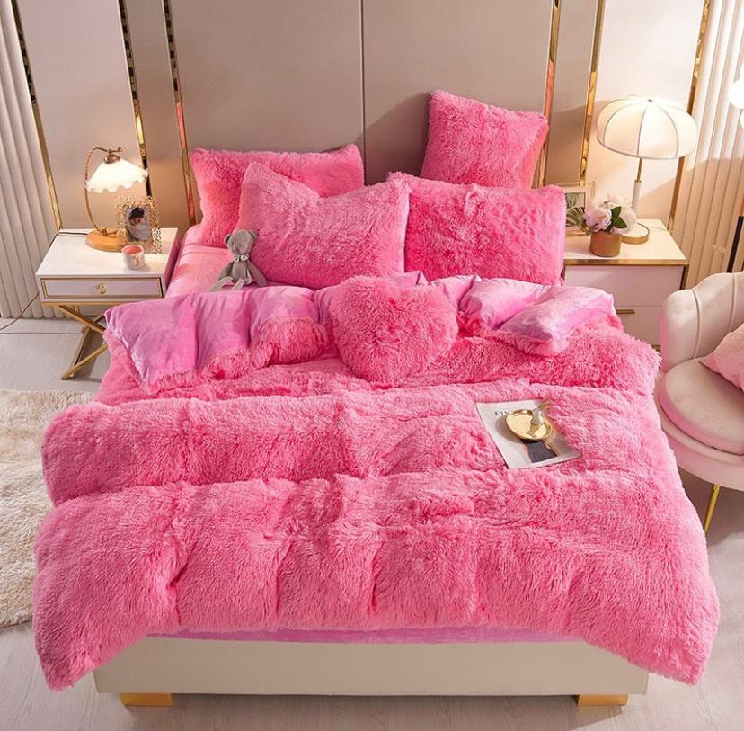 Fluffy Faux Fur Duvet Complete Set- Super Soft Lush and Very Plush Fur Duvet +Bedspread and Matching Pillowcases (4 by 6, 6 by 6, 6 by 7, 7 by 7) Pink Color
