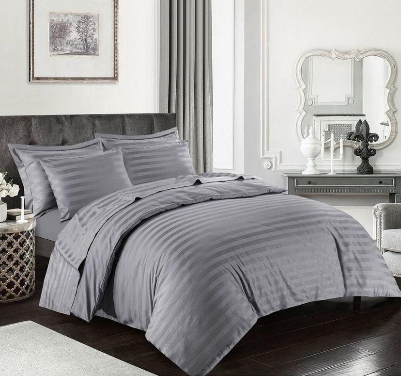 Luxury American Cotton Grey Satin Stripe Duvet Set, Soft Hotel Quality Grey Satin Stripe Luxury Bedding Set, 4/6 Pieces 1 Quilted Duvet, 1 Bedsheet and 2/4 Matching Pillowcases Set (4 by 6/ 6 by 6/ 6 by 7/ 7 by 7 Sizes)